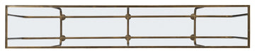Appearing to float in air, the lightly-scaled metal-framed Kiara Sofa Console elevated on metal feet will inspire your interiors. Crafted of iron with a tempered glass top, the console is finished in bronze metal with gold undertones for a warm metal ambience.
