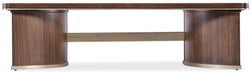 Classy and timeless, the Contours Cocktail Table combines Walnut Veneer, champagne accent trim and a white tempered and beveled glass insert on the wood-framed top. With champagne-finished accent trim, legs and a stretcher, it has a rectangle shape and measures 66 inches wide by 36 inches deep.