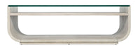 Architectural and timeless with a luxe mixture of materials, the striking Modern Mood Rectangle Cocktail Table has a raffia-wrapped shelf beneath a one-inch-thick tempered glass top. With rounded sides, the table is crafted of Oak Veneers with tactile wire-brush detailing in a light Diamond finish with crystal-like alabaster and pewter hues, offering soft sophistication.