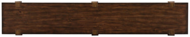 Create a refined rustic ambiance with this stylish mixed media console combining Acacia Veneers, metal sheet and resin in a dark wood distressed finish for authenticity. At only 15 ½ inches deep, this console packs a punch even in small spaces. One fixed shelf.