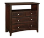 Made in the USA; this media chest with four drawers offers casual style as it accommodates your bedroom TV in any bedroom in your home. Its design elements with framed drawer fronts; tapered feet; and simple molding create a look that fits within contemporary to transitional space. The base rail is gently curved to add dimension to complete this chest of drawers.