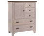 Bring Bungalow charm to your bedroom with this five drawer and a door at the top for clothing storage. Elegant and functional; this chest features with custom-designed drawer hardware includes cup pulls and knobs.