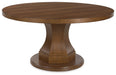 This striking dining table looks equally at home in traditional or modern settings. Its classic pedestal base supports a deliciously contemporary tabletop with a high contrast brown wood tone finish. This timeless design adds a tastefully transitional touch that's sure to serve you well.